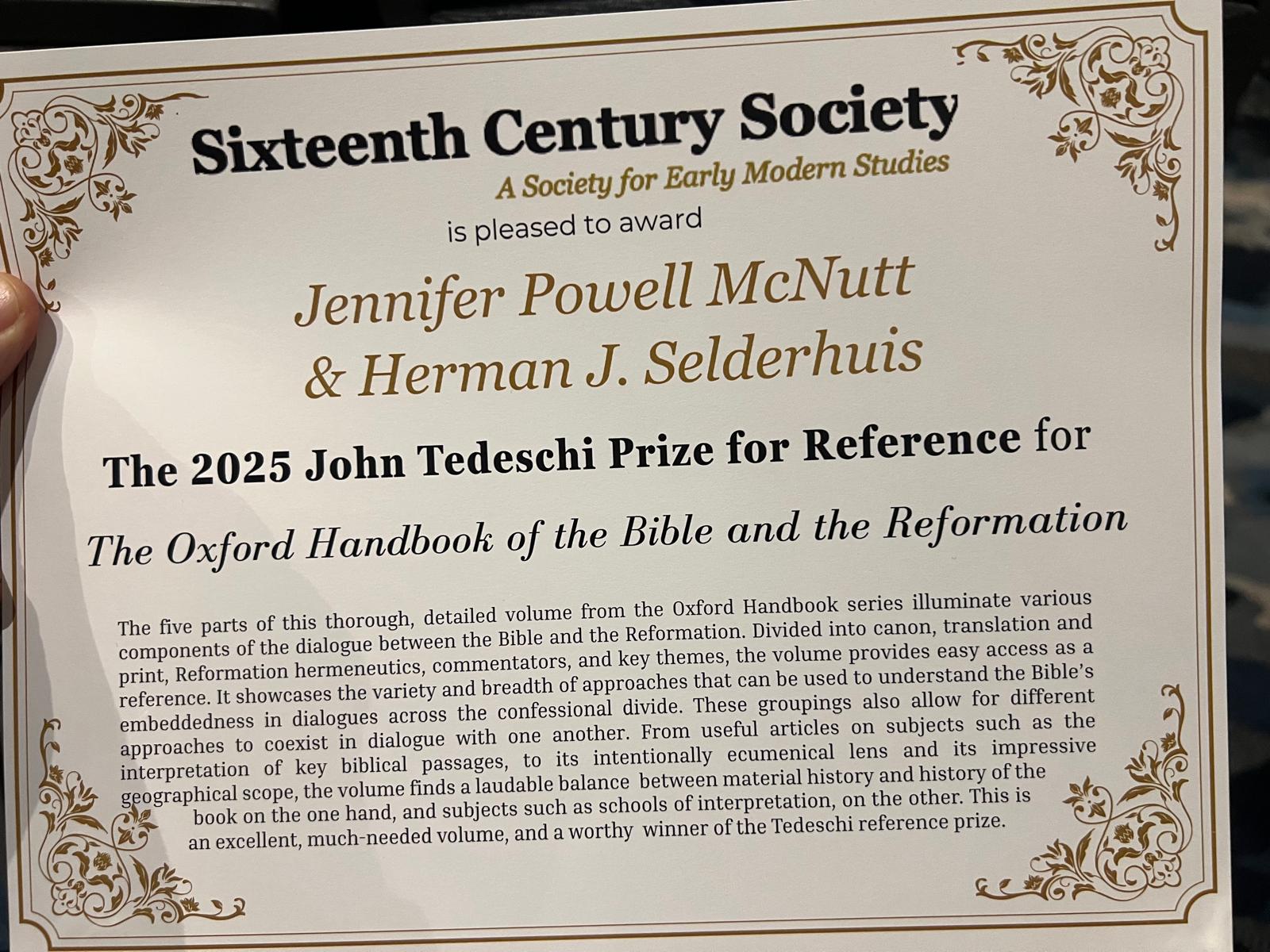 Jennifer Powell McNutt and Herman Selderhuis have been awarded with the Sixteenth Century Society’s John Tedeschi Prize for the best reference work: The Oxford Handbook of the Bible and the Reformation.