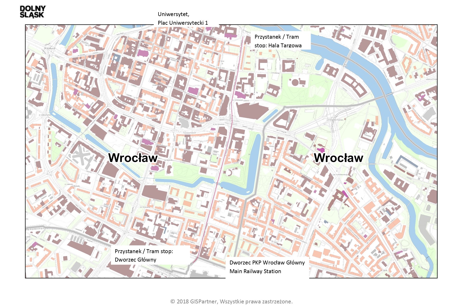 Option 1. After leaving the railway station on the northern side, turn left and walk to the nearby tram stop called Dworzec Główny (Main Railway Station). Take tram 8 (direction: Karłowice) or 9 (direction: Sępolno), ride 3 stops and get off at Hala Targowa (Market Hall). The main building of the university is approximately 450 m to the west.